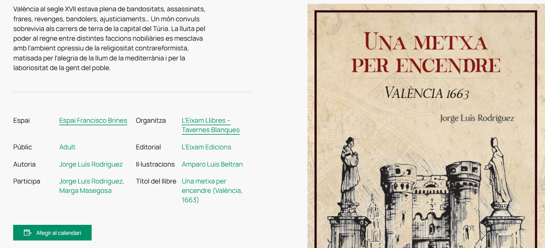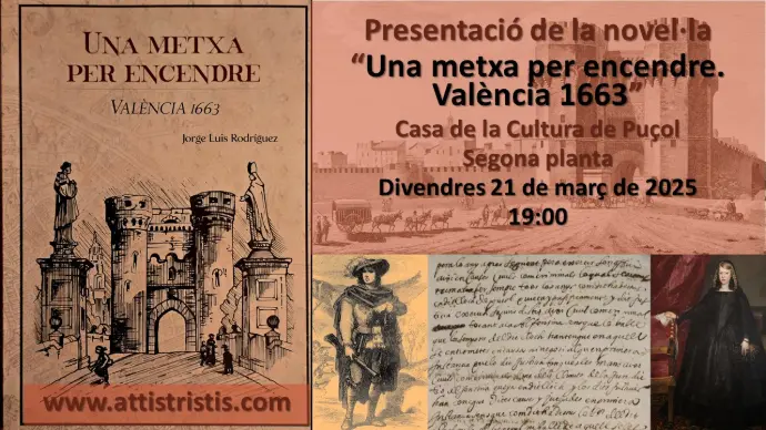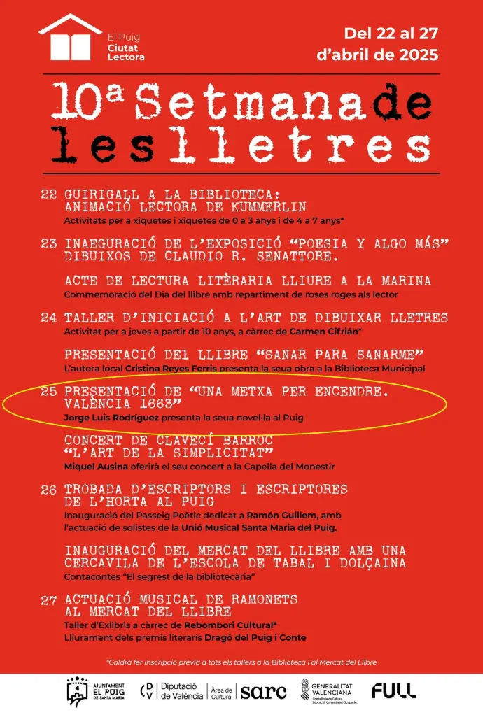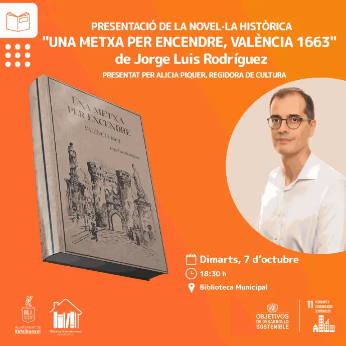 Presentació de la novel·la "Una metxa per encendre. València 1663", a la setmana d'actes del 9 d'octubre per part de l'Ajuntament de Rafelbunyol. Fotos de l'instagram de l'ajuntament.