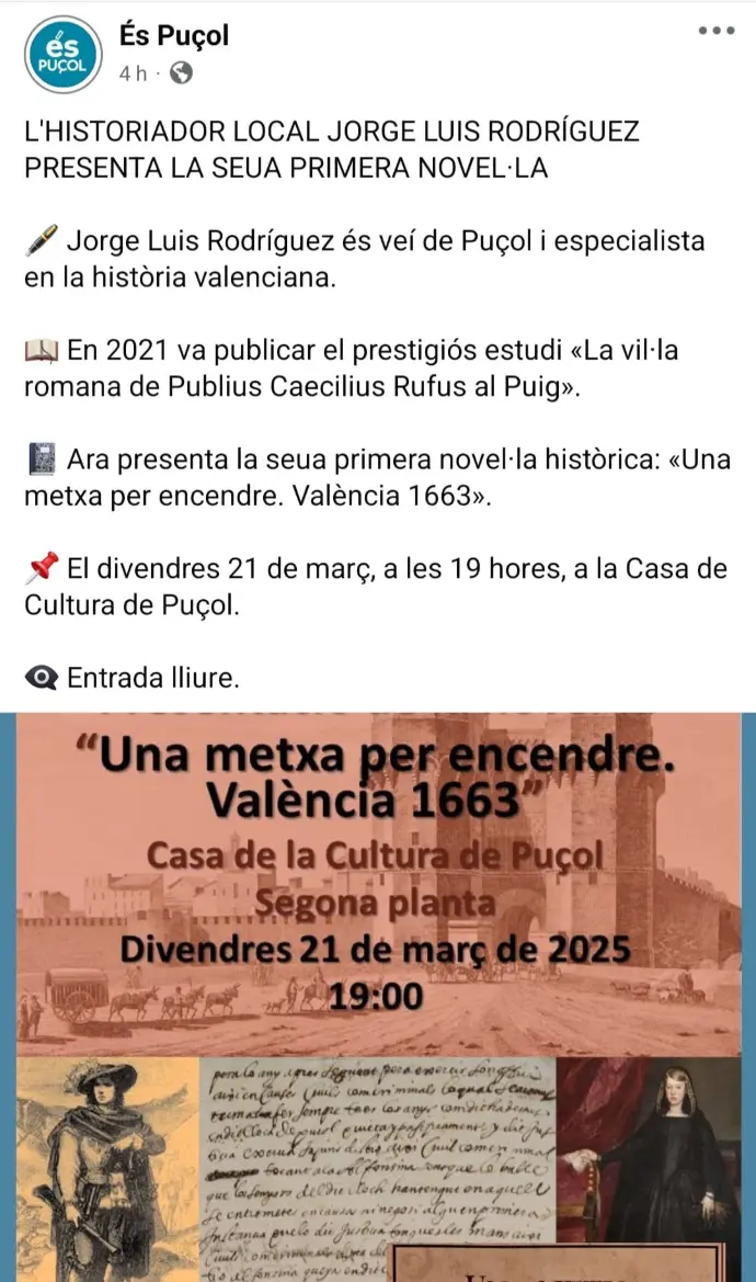 Informació de la presentació de la novel·la a les xarxes socials de l'Ajuntament de Puçol